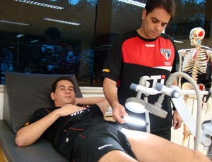 O novo camisa 8 chegou ao Morumbi com uma lesão no músculo reto femural, ainda da época do Santos. O tratamento em sua coxa esquerda tem sido feito em dois períodos e a evolução anima o departamento médico.